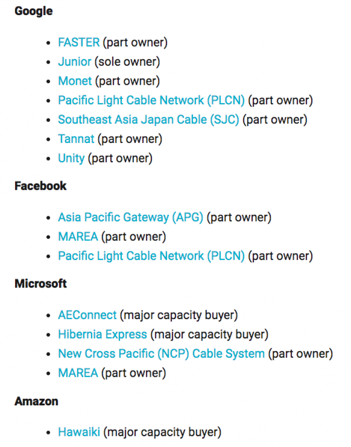 Câbles propriétés des GAFA en mai 2016Ci-contre les câbles propriétaires des GAFA en mai 2016. Il faut rajouter, par exemple, le câble Jupiter, dont Amazon et Facebook seront propriétaires avec d'autres entreprises, et reliera l’Asie aux Etats-Unis en 2020.