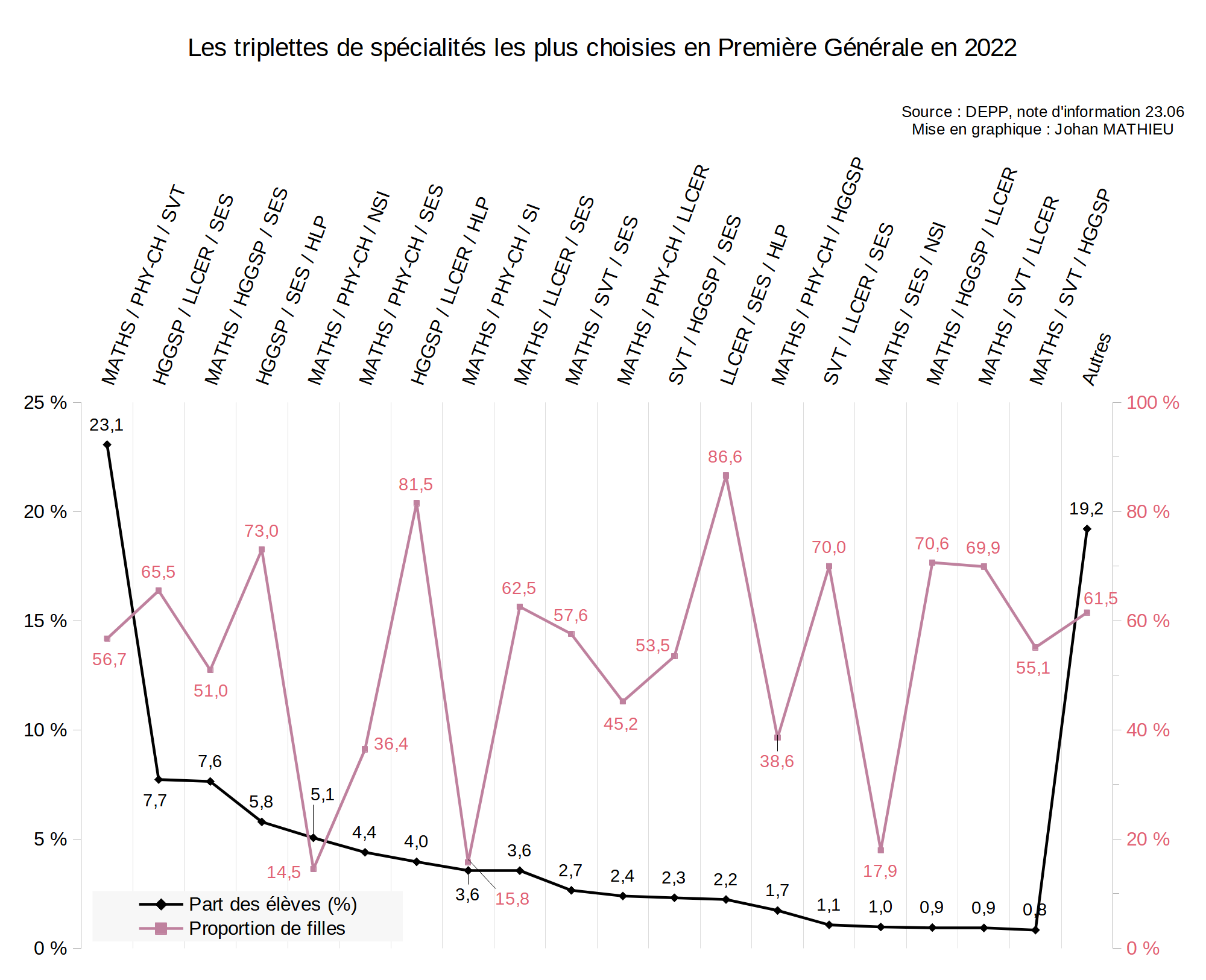 Voici différents graphiques issus des données de la rentrée 2022 (source), qui permettent d'analyser les enseignements de spécialités et les options choisies selon différents facteurs.