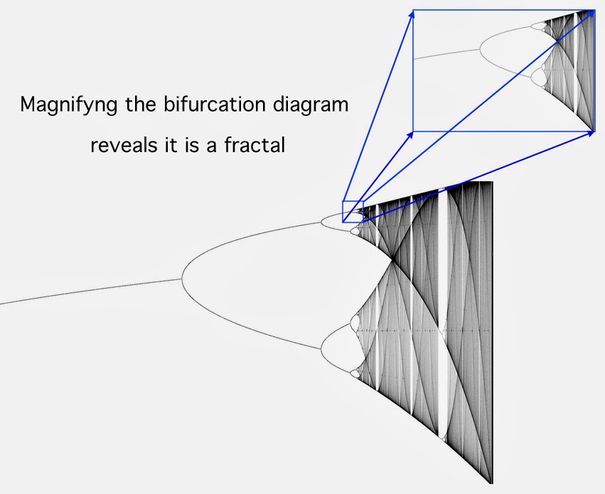 C'est le cas de la fonction logistique \(f(x)=4x(1-x)\) dont le diagramme de bifurcation fait apparaître une structure fractale identique à celle de l'ensemble de Mandelbrot !