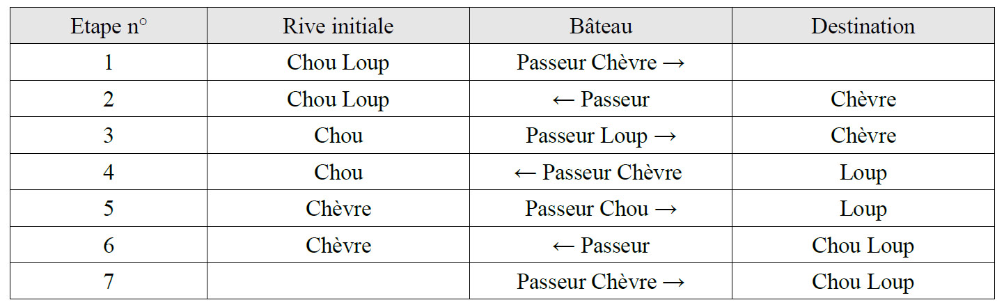 Par exemple, (1,1,0) signifie que le chou est sur la rive initiale, alors que la chèvre et le loup sont sur l’autre rive.