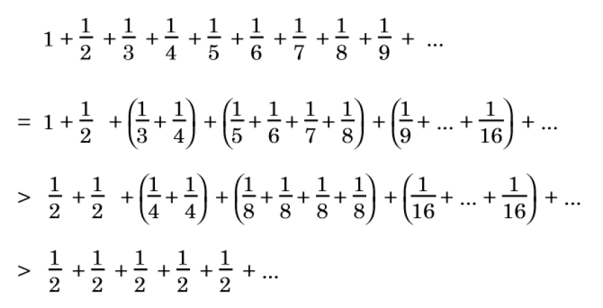 Le français Nicole (Nicolas) Oresme5 est considéré comme le premier savant à avoir démontré, au milieu du XIVe siècle, que cette somme est infinie. Écrite rapidement, l’idée (de génie !) d’Oresme est la suivante :