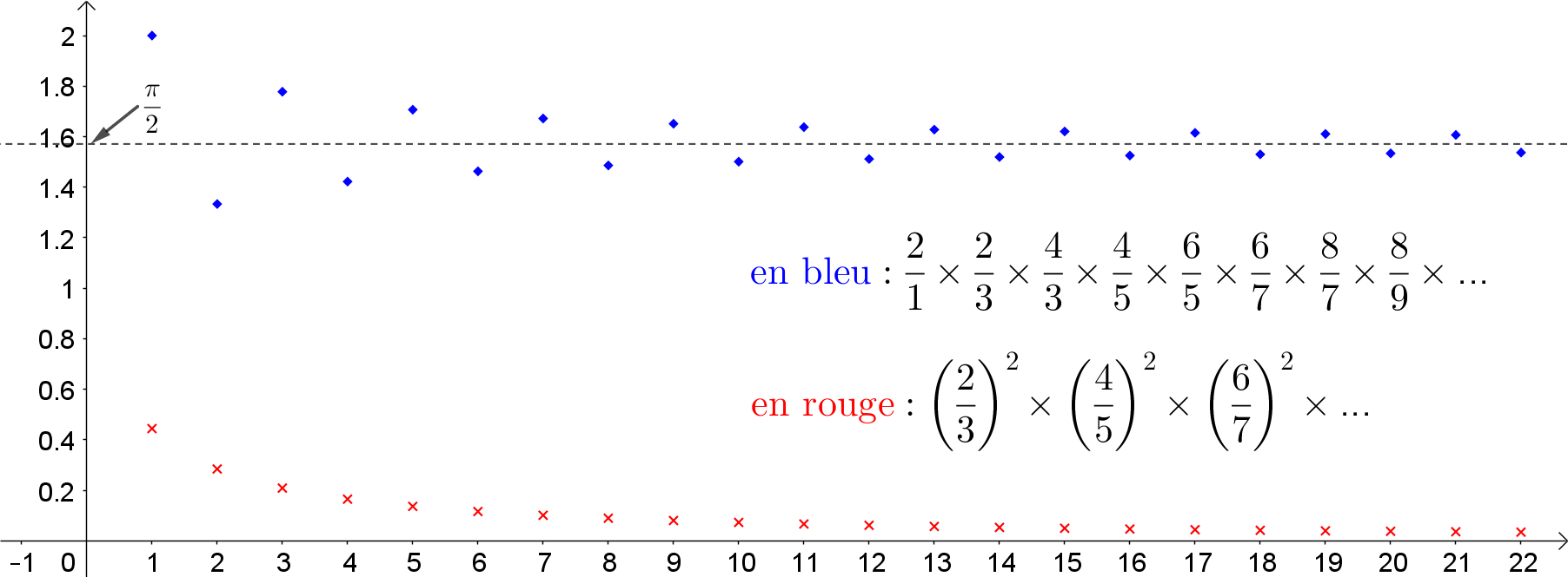 Ceci est un produit de termes tous strictement inférieurs à 1, donc il est strictement inférieur à 1 et par conséquent à \(\frac{\pi}{2}\). On peut même démontrer que ces nouveaux produits tendent vers 0 :