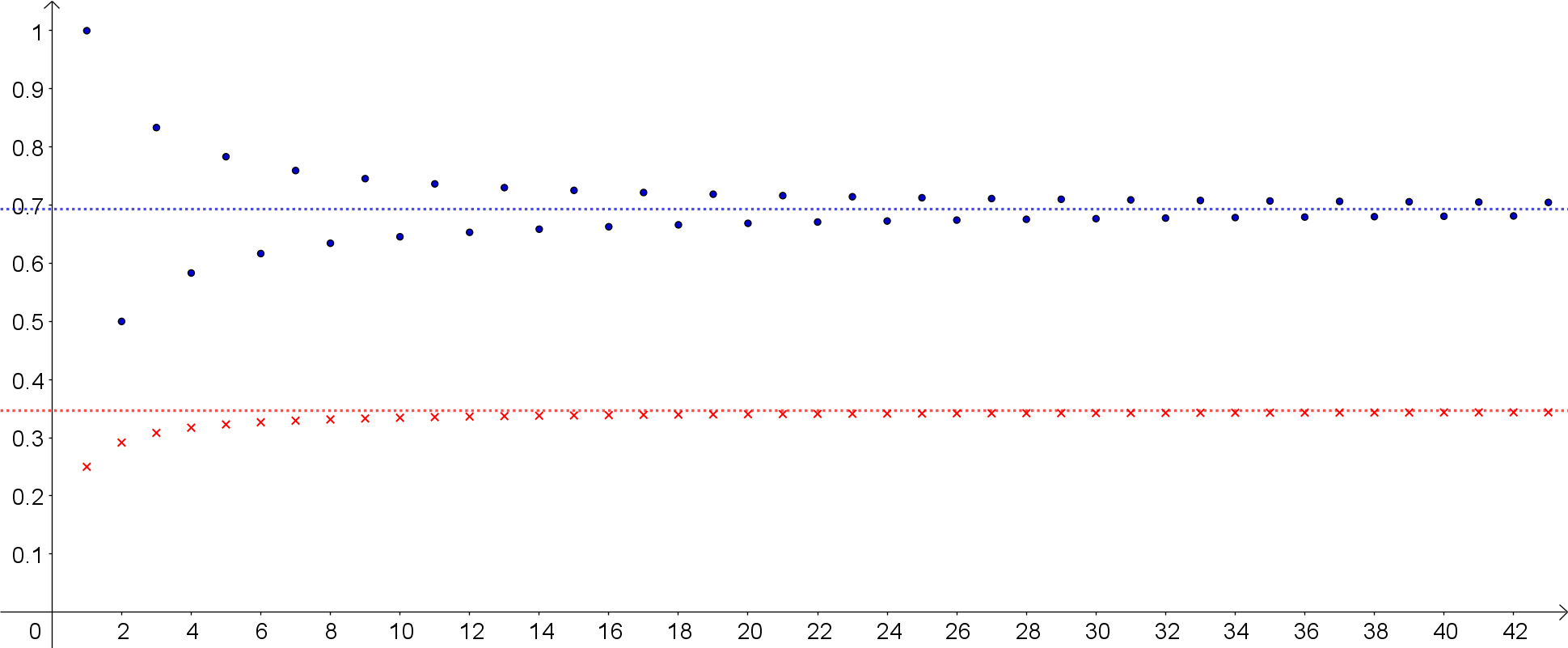 Un exemple classique est celui de la série harmonique alternée, notée \(S\) : \({1}-\frac{1}{2}+\frac{1}{3}-\frac{1}{4}+\frac{1}{5}-\frac{1}{6}+\frac{1}{7}-\frac{1}{8}+\frac{1}{9}-\frac{1}{10} + ...\).
