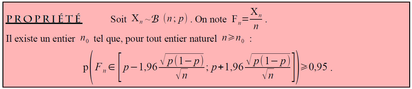 • Un exercice pour démontrer qu'à partir d'un certain rang, la probabilité que la fréquence Fn appartienne à l'intervalle de fluctuation vu en Terminale est SUPERIEURE à 95% : (et sa correction)