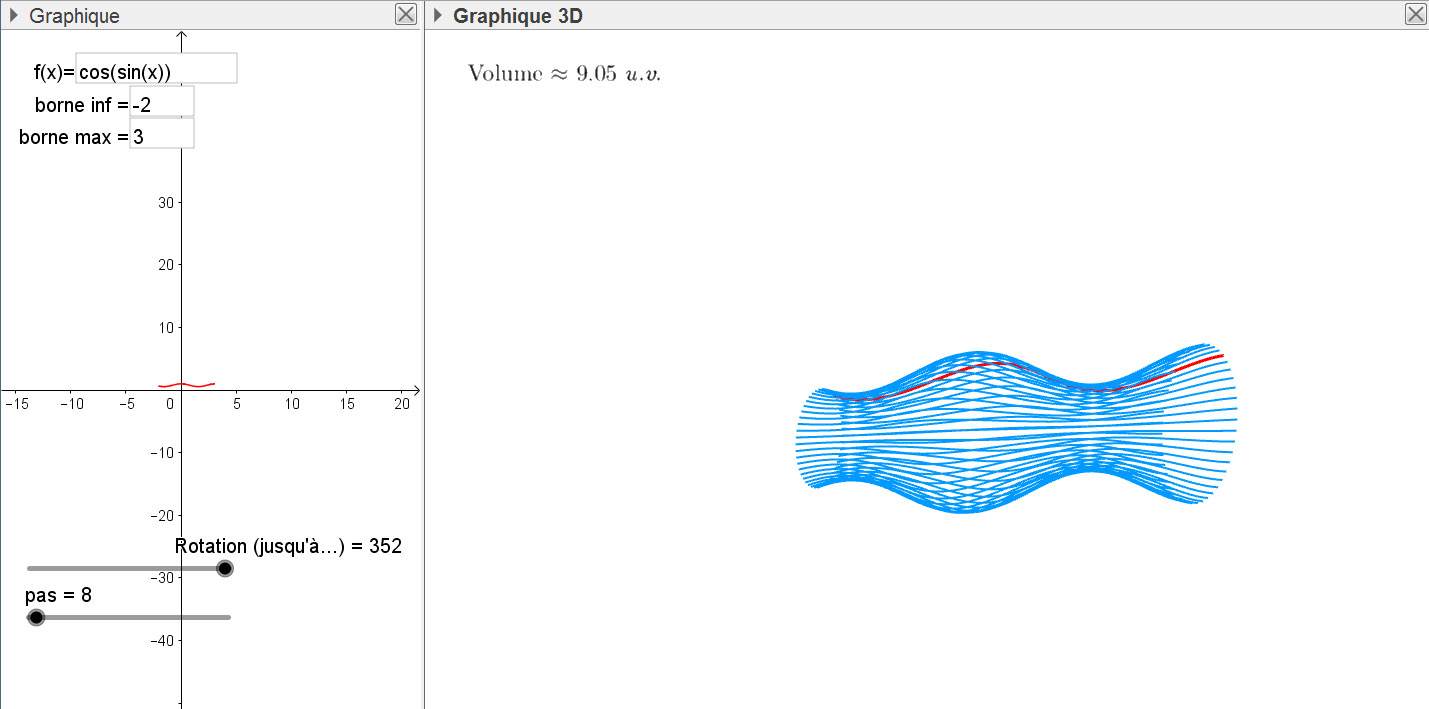 • Volume engendré par la rotation d'une fonction (fichier Geogebra en ligne) :