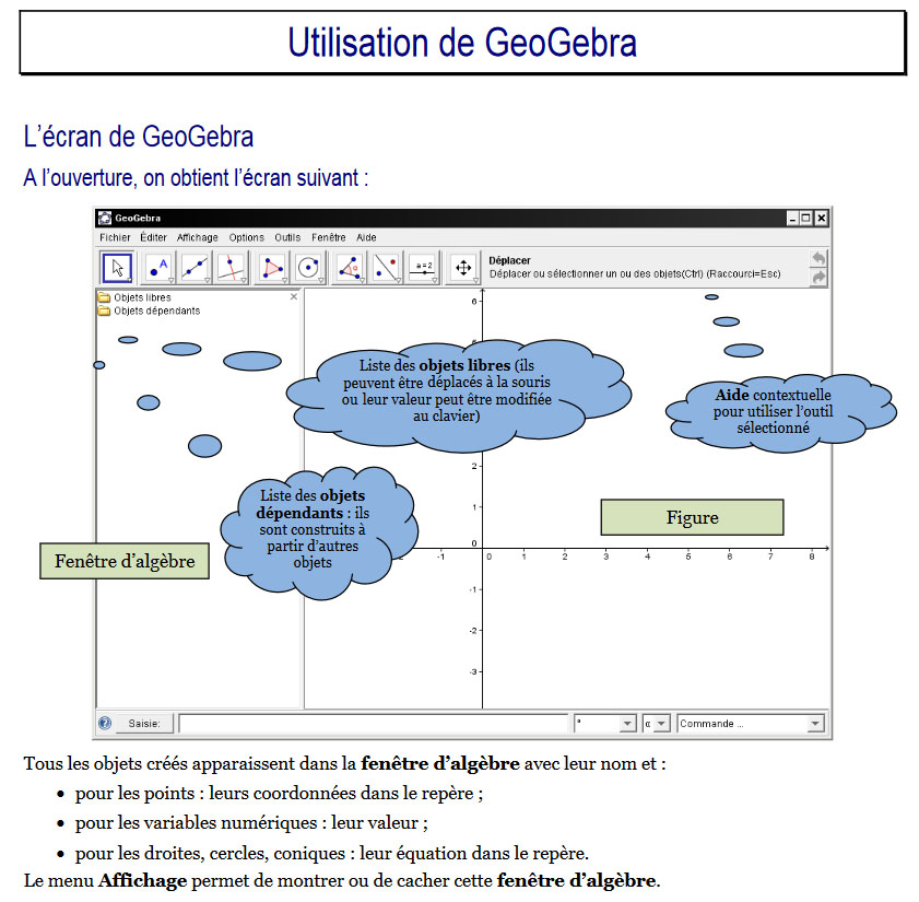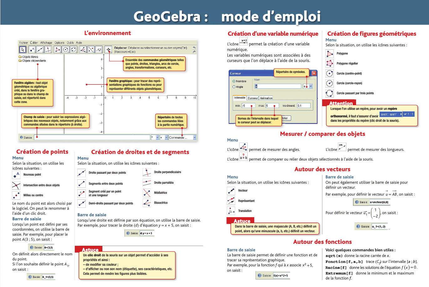 Remarque : pour une utilisation en ligne de Geogebra, cliquer ici. Mais l'affichage sera peut-être légèrement différent...