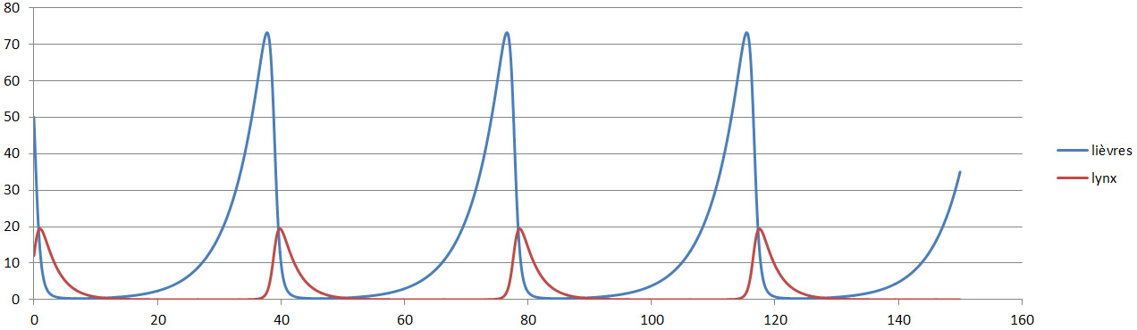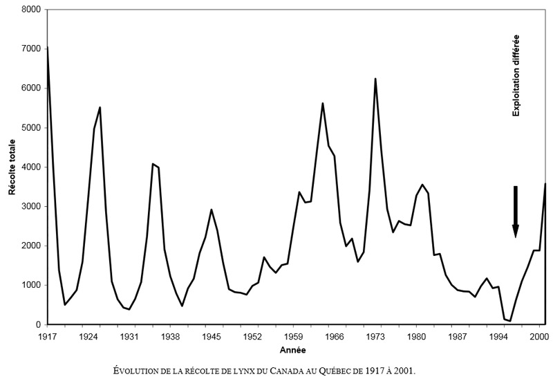Il est fascinant d'observer que ce modèle décrit parfaitement les évolutions cycliques du nombre de lynx et de lièvres des neiges au Canada. Au Québec, l'analyse des données de récolte de fourrures de lynx depuis 1917 a permis d'évaluer la fréquence des oscillations du cycle à 9,1 ans :