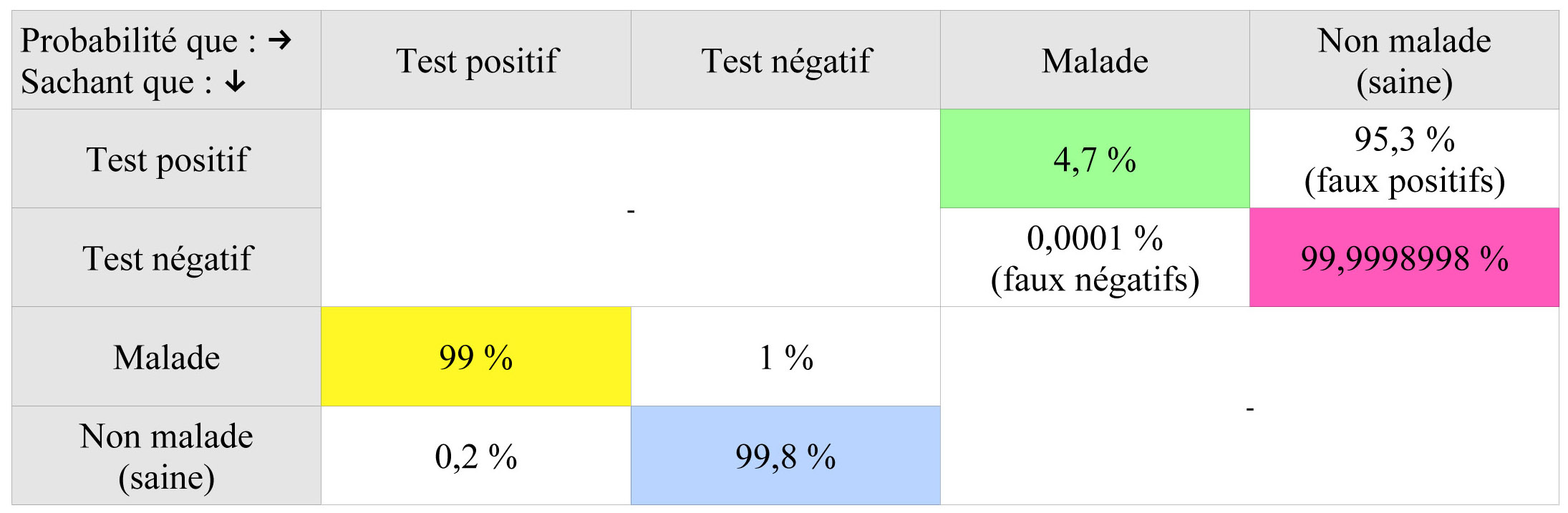 Mais alors, puisque la probabilité qu'une personne soit malade sachant que son test est positif est très faible (4.7 %), voilà que ce test nous paraît un peu "inutile"...