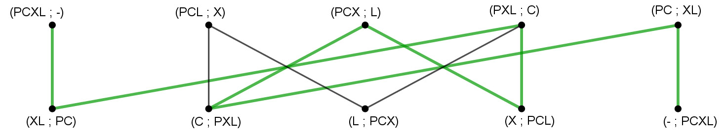 Le couple (PCX ; L) signifie que le passeur est sur la rive initiale avec la chèvre et le chou (qui sont donc sous surveillance), alors que le loup est sur l’autre rive.