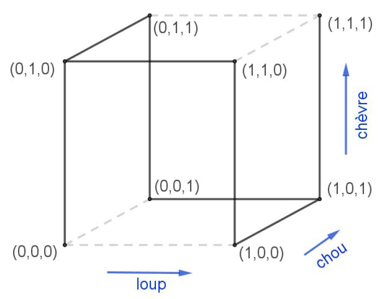 Par exemple, (1,1,0) signifie que le chou est sur la rive initiale, alors que la chèvre et le loup sont sur l’autre rive.