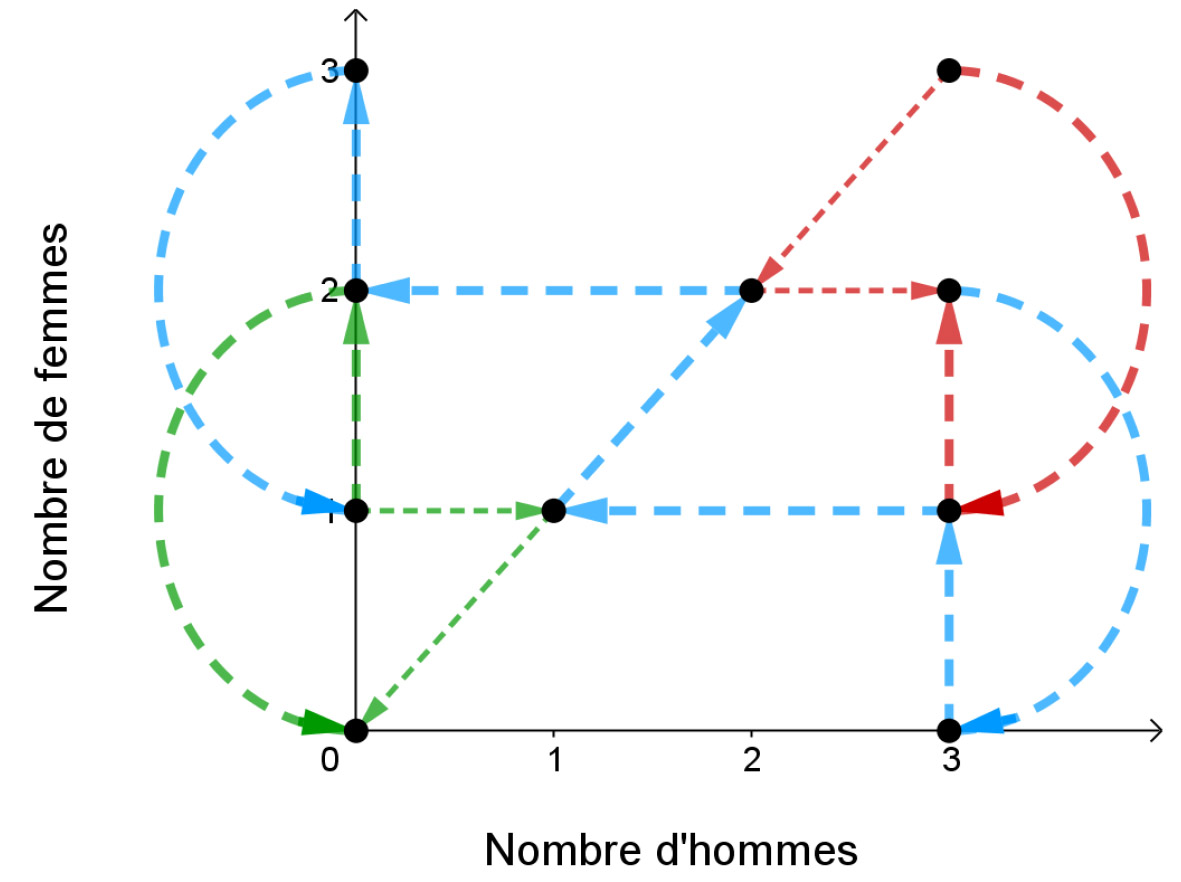 Une façon efficace de voir le problème est de considérer les trajets possibles en fonction du nombre de femmes et du nombre d’hommes sur la rive initiale (sans distinction de « couples » frère/sœur).
