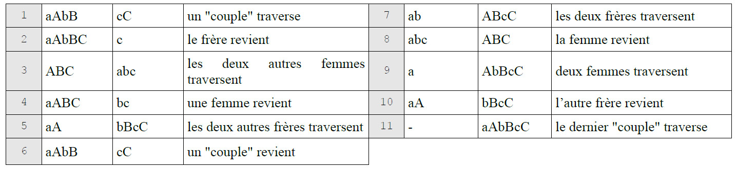 Il y a donc 4 variantes possibles, sans compter les permutations des « couples », et il faut au minimum 11 étapes pour résoudre le problème.