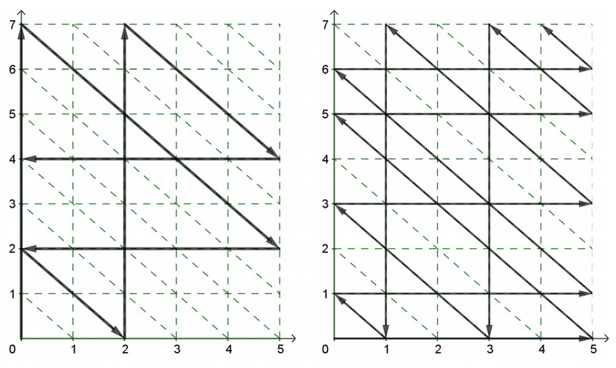 L’axe des abscisses représente la contenance du bidon de 5 L, tandis que l’axe des ordonnées représente celle du bidon de 7 L.
